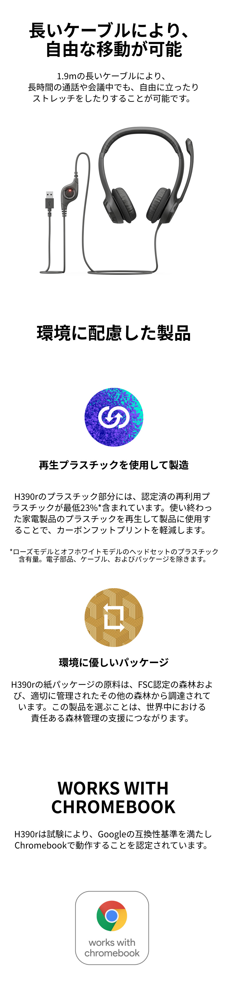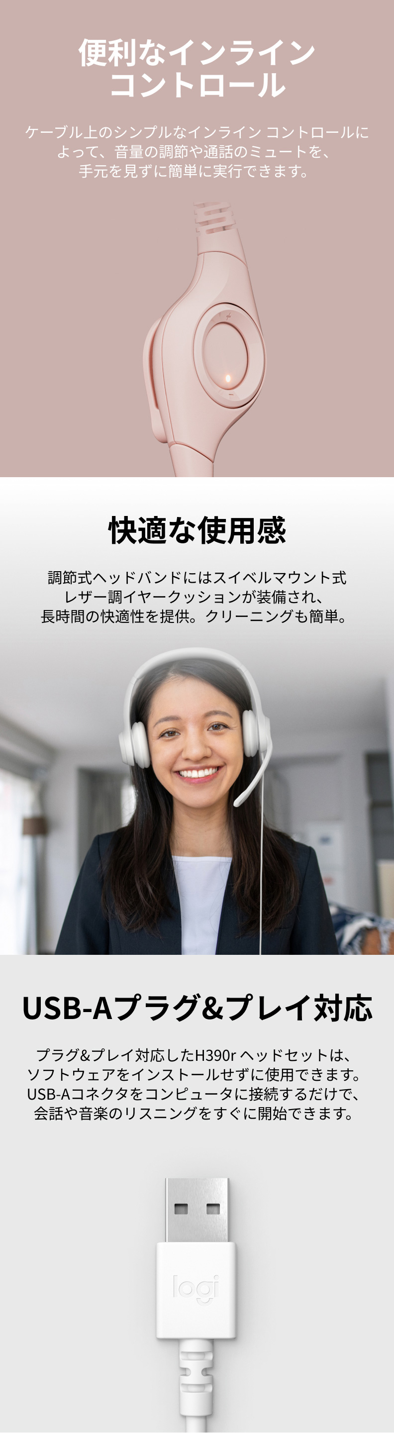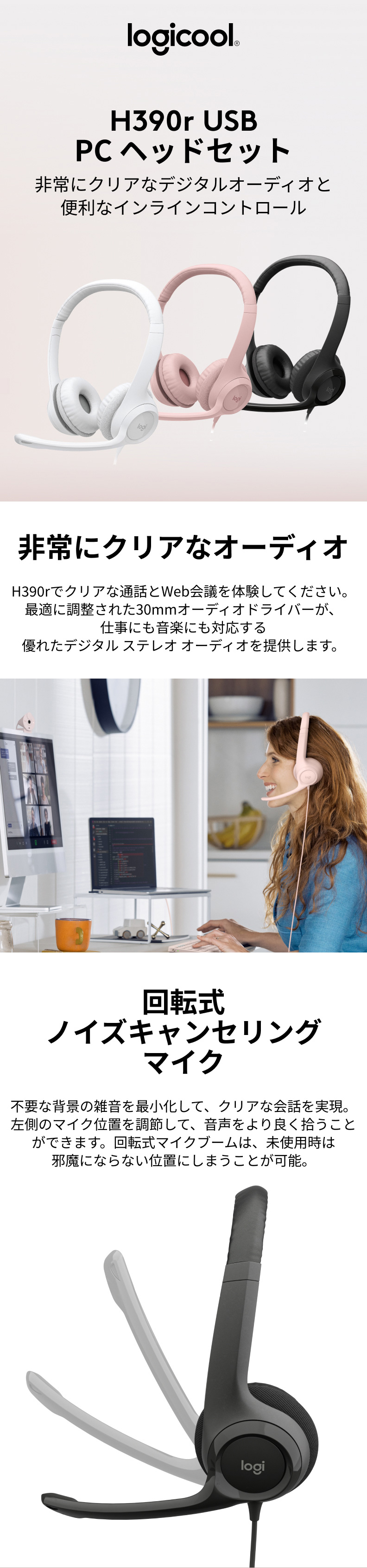 Logicool ロジ logi logitech ロジクール ヘッドフォン ヘッドセット マイク headset PC USB コンパクト コントローラー 会議 ミーティング オンライン会議 Web会議 オンライン授業 ビデオ通話 ビデオ会議 サステナビリティ Windows pc mac macOS macbook chromeOS Works With Chromebook 黒 白 ブラック ホワイト ピンク H390 H390r H390rOW H390rRO 4943765047582 4943765060062 4943765060055
