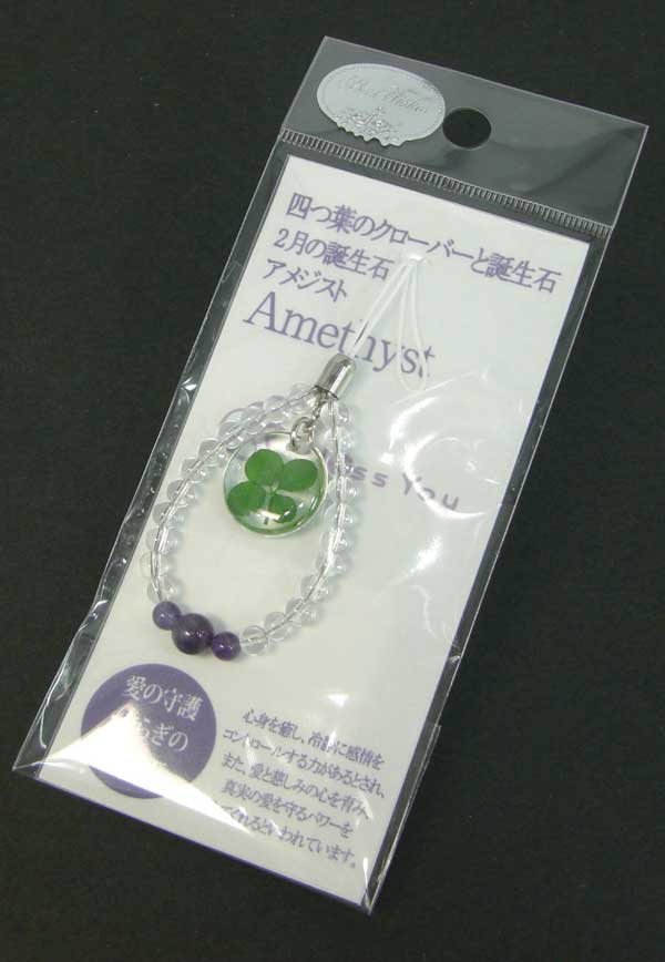 四葉のクローバーと誕生石のストラップ 2月 アメジスト AHA7002 幸運のアイテム ラッキーアイテム 天然四つ葉を使用 ART-HOP アートホップ