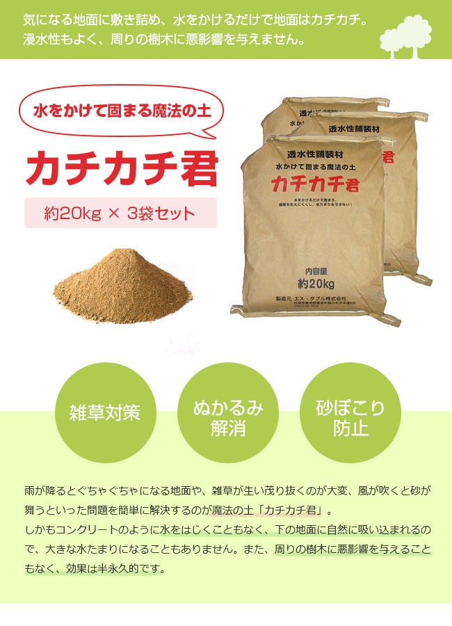 カチカチ君 約20kg《3袋セット》 透水性舗装材 水をかけて固まる魔法の土(防草土 草対策 雑草対策 雑草防止 固まる土 ガーデニング かちかち君) メーカー直送