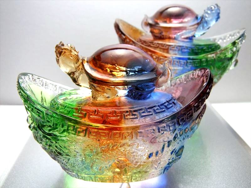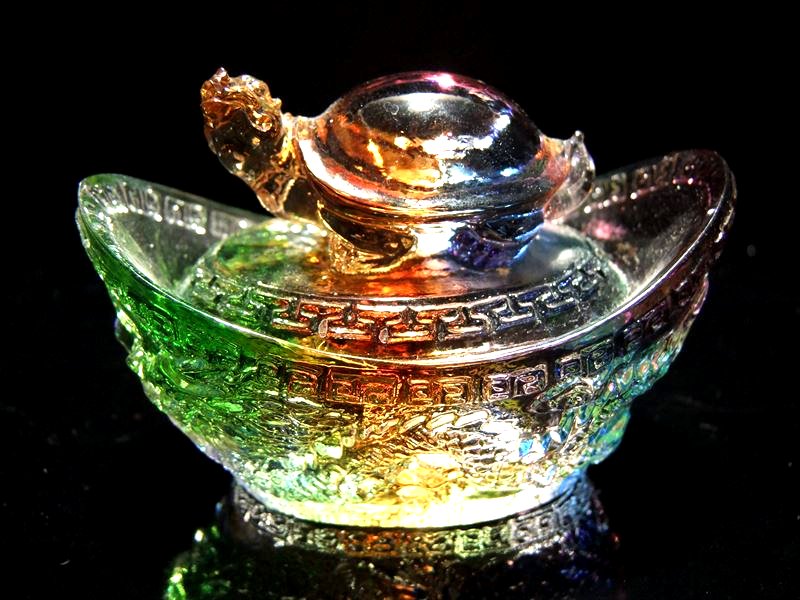 瑠璃製 レインボーカラーの亀装飾 元宝(元寶)